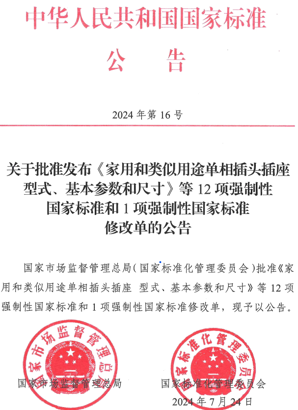 日前,国家市场监督管理总局(国家标准化管理委员会)发布《关于批准发布〈家用和类似用途单相插头插座 型式、基本参数和尺寸〉等12项强制性国家标准和1项强制性国家标准修改单的公告》。具体内容如下: