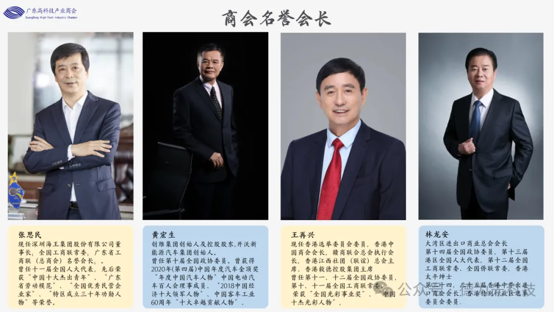 自1999年成立至今,广东高科技产业商会始终以“从善的科技担当,高远的天下格局,分享的利他情怀,夺冠的精神意志,折腾的生命基调。”为核心价值观,在广东科技产业的土壤中深耕不辍。26年间,商会见证了无数科技企业从0到1、从1到N的创新破茧与华丽蝶变。